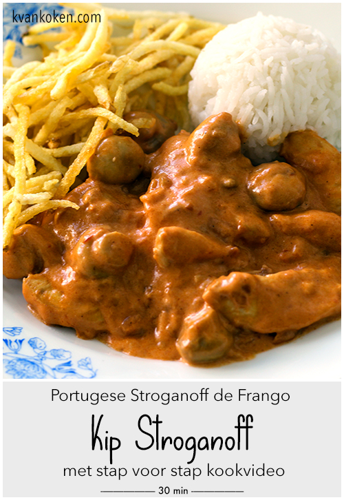 Stroganoffsaus is van oorsprong een pittige saus uit Rusland, die traditioneel wordt geserveerd bij biefstuk of roodvlees. De combinatie met kip of kalkoen is dus verrassend. Hier in Portugal wordt de stroganoff vaak geserveerd met een bolletje rijst en friet, of zoals hier op de foto, mini frietjes uit een zakje die hier ‘batata palha’ heten, maar aangezien dit recept koolhydraatarm is kun je het natuurlijk ook prima combineren met bijvoorbeeld bloemkoolrijst of een lekkere groenteschotel.