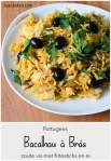 Van dit populaire kabeljauwrecept wordt gezegd dat het is verzonnen door een herbergier, Brás of Braz geheten, die een taverne had in de Bairo Alto (oude wijk) in Lissabon. Het recept is eenvoudig te maken en bijzonder smakelijk. Het is zo populair dat het zelfs tot in Spanje op de menukaart prijkt als ‘Revuelto de bacalao a la Portuguesa’ (roerei van bacalhau op z’n Portugees)