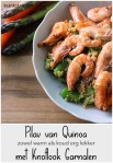 Eindelijk overstag! Ik moest het toch een keer proberen, quinoa, en het resultaat viel niet tegen. Ik was van plan een pilav te maken, een rijstgerecht met groenten en kruiden met lekker grote garnalen in knoflook gebakken. In plaats van de rijst heb ik nu de quinoa gebruikt. Quinoa (spreek uit Kien-wah) komt uit Zuid-Amerika en is het zaad van een plant, maar het is geen graan. Het zit boordevol goede stoffen, eiwitten, aminozuren, vitamines en mineralen.