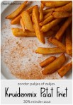 De meeste kruidenmixen voor friet die je in de schappen van de supermarkt vindt bevatten bijna de helft aan zout. Natuurlijk is een beetje zout op je patat lekker, maar als je toch besluit om er ook wat kruiden en specerijen aan toe te voegen, dan mag het best een beetje minder. Ik heb ik deze kruidenmix 3 theelepels selderijzout (17,5%) en 1 theelepel grof zeezout (6%) toegevoegd. Selderijzout bestaat voor 85% uit zout. Enig rekenwerk leert dan dat in dit kruidenmengsel ongeveer 20% zout bevat. Toch is het net zo smaakvol. Probeer het maar.