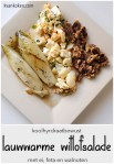 Op warme dagen wil mijn lieve wederhelft het liefst koud eten, terwijl ik een warme maaltijd ook zo op prijs stel. Dit is de ultieme weg door het midden; niet warm en ook niet koud. De witlof wordt eerst gebakken en gesmoord en dan gecombineerd met de koude ingrediënten. Ik heb een eetlepel honing gebruikt, maar wil je dit recept volledig koolhydraatarm bereiden, voeg dan ipv honing een beetje zoetstof toe.