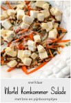 Een simpel recept voor een lekkere salade. Ik had een flinke zak wortelen en het is hier in Portugal echt nog te warm voor hutspot. Ik heb de worteltjes rauw gehouden, maar je zou ze ook heel even kunnen blancheren. Ik denk dat kinderen de salade dan meer zullen waarderen.
