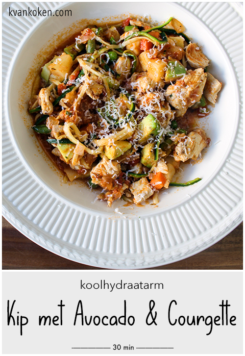 Voeg, als de kipblokjes gaar zijn de tomatenstukjes met wat tomatensaus uit het blik bij. Voeg de kruiden toe en breng op smaak met zout en peper. Laat dit prutje nog eens een minuut of 10 lekker sudderen tot de ui bijna verdwenen is. Voeg na 5 minuten de diepgevroren groenten toe en aan het eind van de bereidingstijd de avocadoblokjes en de courgettesliertjes. Warm alles nog even goed door.