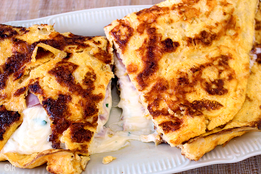 Keer de omelet met een brede spatel. Beleg de bovenzijde met de plakjes ham en daarop het roomkaasmengsel. Gebruik een vork om de kaas voorzichtig over de gehele oppervlakte te verspreiden. Zet de deksel op de pan en heb nog een beetje geduld. De Parmezaanse kaas ligt nu op de bodem van je koekenpan en zal smelten. In eerste instantie plakt je omelet dus aan de bodem. Geen paniek! Gewoon de tafel gaan dekken, een wijntje inschenken of de broodjes uit de oven halen. Zo nu en dan even de deksel van de pan en schudden. Komt de omelet los van de bodem, dan is hij klaar. Wip voorzichtig met je brede spatel de omelet dubbel en laat hem op een serveerschaal glijden.