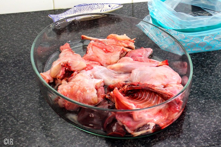 In Portugal koopt men meestal een konijn of kip die nog niet in stukken is gesneden. Veel Portugezen van mijn leeftijd en soms nog jonger herinneren zich zelfs dat het dier de dag voor het werd gegeten, werd geslacht. De man des huizes slachtte het dier, trok het zijn jas of verenpak uit en dan kreeg moeder de vrouw een nog warm dier in de handen gedrukt en moest zij het uitbenen ervan zelf doen.