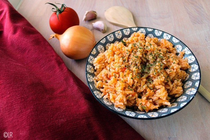 Een heerlijk bijgerecht bij vis is deze eenvoudige schotel van tomatenrijst. Je kunt er natuurlijk ook verse hele rijpe tomaten voor gebruiken, maar haal dan wel even het schilletje eraf. Tien seconden dompelen in kokend water en het velletje laat gemakkelijk los. Gebruik je verse tomaten voeg dan ook nog 200 ml tomatensap toe.
