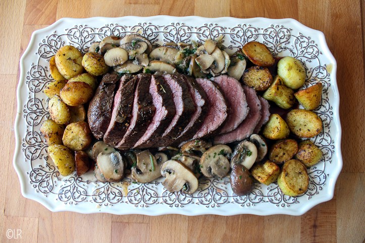 o Snij nu het vlees in mooie plakken en serveer met de aardappeltjes en de champignons.