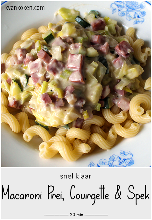 Gisteren bleef er een courgette over en eergisteren een prei. Vandaag moet de koelkast leeg en graas ik langs de planken wat er nog meer in ligt. Ah mooi, crème fraîche, gerookt spek en geraspte kaas. Mooi, dan gaat dat hem worden! Lekker met macaroni.