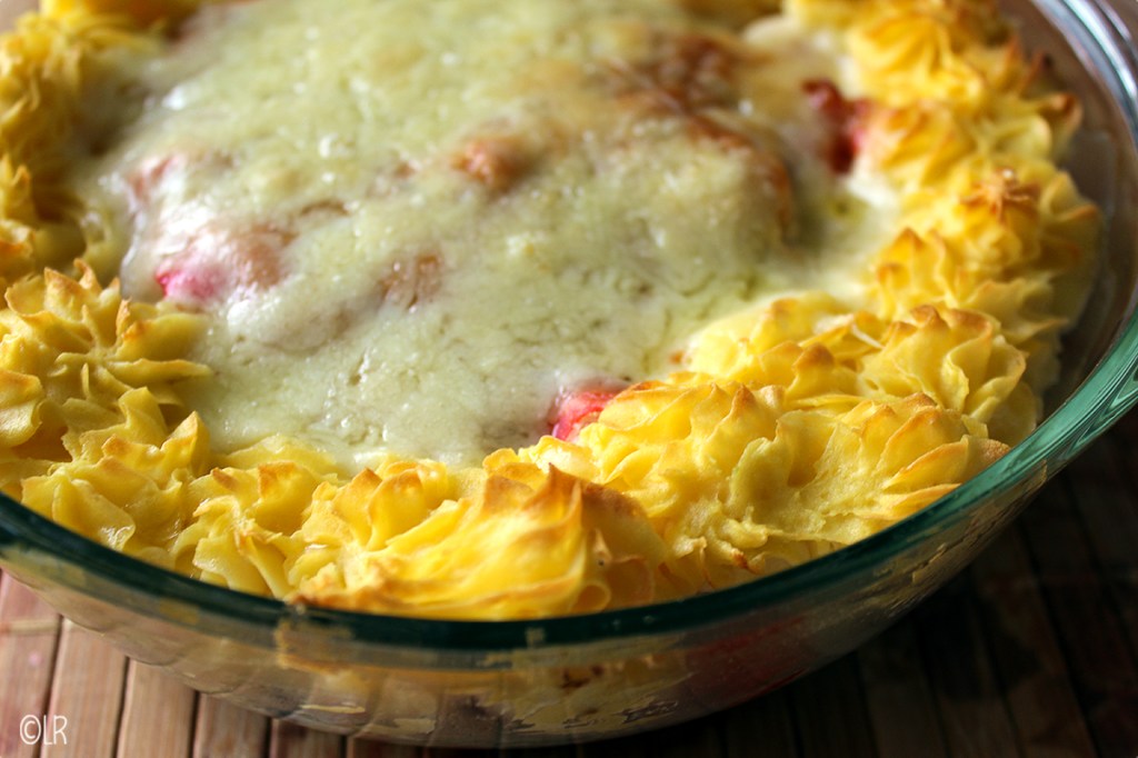 o Schep de aardappelpuree in een spuitzak met kartelmondje en maak aardappel roosjes langs de rand;