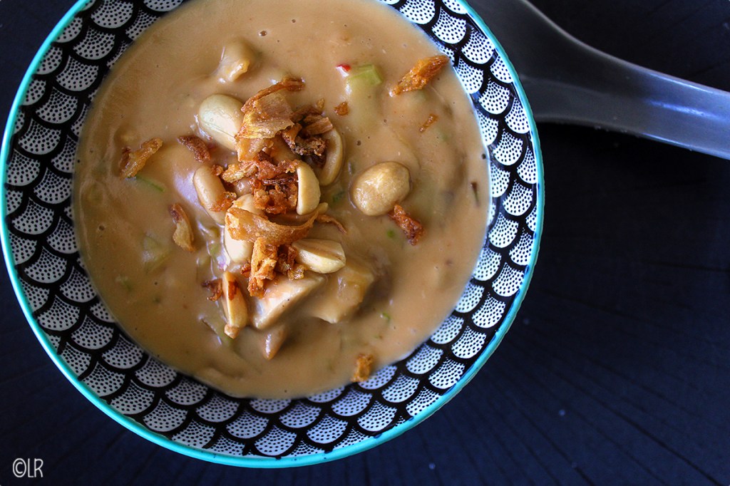 Serveer de soep met wat pinda’s en geroosterde uitjes.