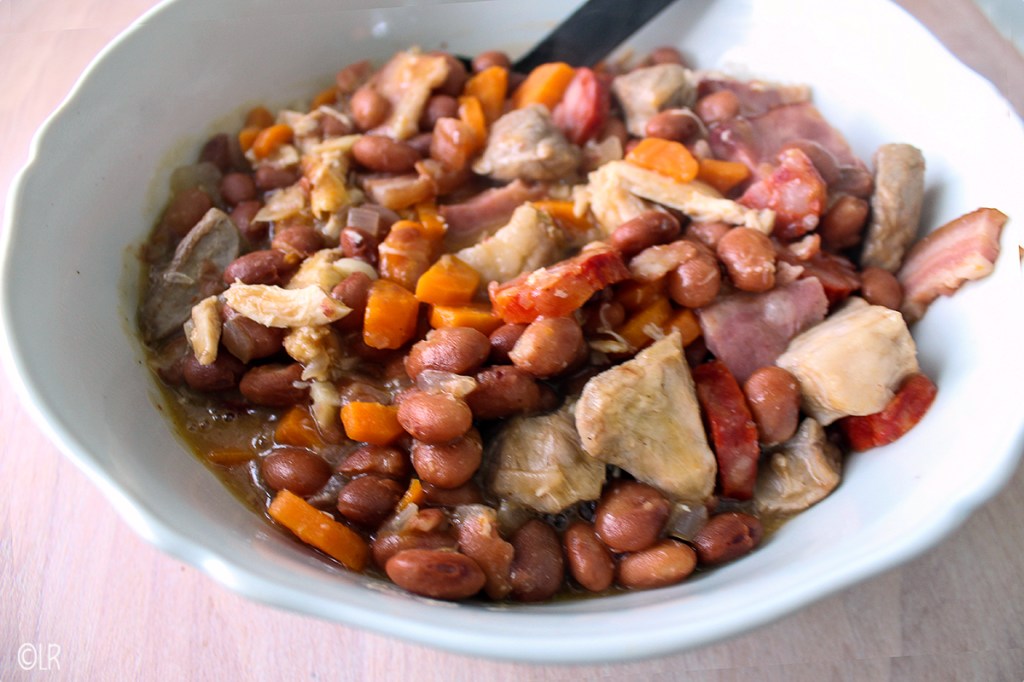 De feijoada à Portuguesa is een uitgebreide bonenschotel met veel vlees, behoorlijk veel vlees. Er gaat een varkenspoot en een varkensoor in, spareribs, bloedworst, chouriço corrente en in het noorden van Portugal ook nog kool. Onmogelijk om daar een tweepersoonsschotel van te maken.