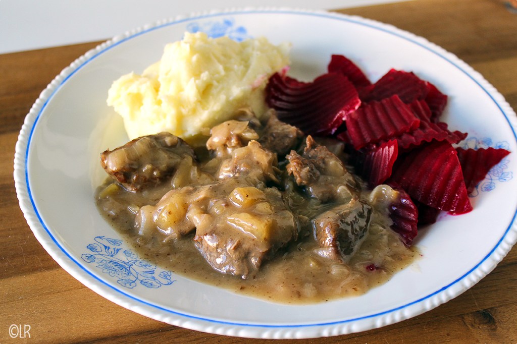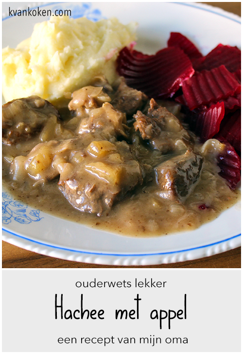 Hachee werd vroeger gemaakt van restjes vlees. Had oma bouillon getrokken, dan werd het vlees in de hachee verwerkt. Zo kon je zowel soep als de hoofdmaaltijd serveren van hetzelfde stukje vlees. Ik heb het recept nu aangepast naar het gebruik van rauw vlees, wat ik wel heb bewaard is het toevoegen van een appel. Ik heb wel recepten gezien waar bijvoorbeeld appelstroop werd gebruikt, maar nog niet eerder zag ik een recept waar een hele appel in gaat. Zo kun je de suiker weglaten. In plaats van azijn heb ik droge witte wijn gebruikt, domweg omdat ik dat lekkerder vind.
