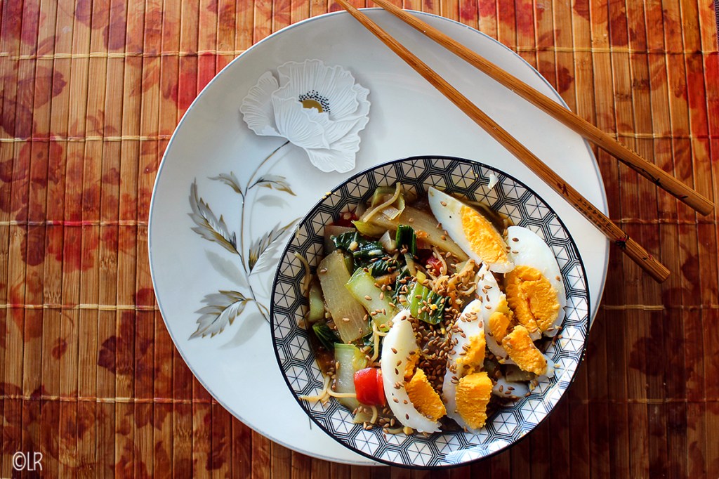 Een vegetarische versie met heel veel groenten. De bamboescheuten kun je vervangen door taugé. Als je geen palmsuiker hebt kun je natuurlijk ook wat bruine (riet)suiker gebruiken. De geroosterde sesamzaadjes geven het net dat beetje extra. Heb je die niet, probeer het dan eens met geroosterde uitjes, ook heel lekker.