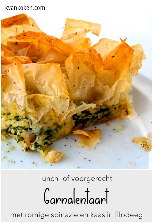 Dit elegante gerechtje doet het goed bij de lunch. Het kan zowel warm als koud worden geserveerd en je kunt, wanneer je kleinere vormpjes gebruikt, er ook nog eens een leuk voorgerechtje van maken. Een allemansvriend dus, voor wie van garnalen, kaas en knapperig filodeeg houdt.