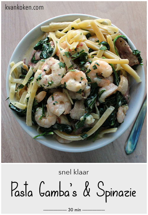 Het is niet het eerste recept in mijn kookblog dat gamba’s of garnalen combineert met romige spinazie en pasta. Dit recept wordt bijzonder door de knapperig gebakken stukjes spek. Het geeft het gerecht die heerlijk rokerige, zoutige toets. Fijn aan dit recept is ook dat het weer in een half uur op tafel staat. Feestelijk genoeg voor een glas sprankelende droge witte wijn.