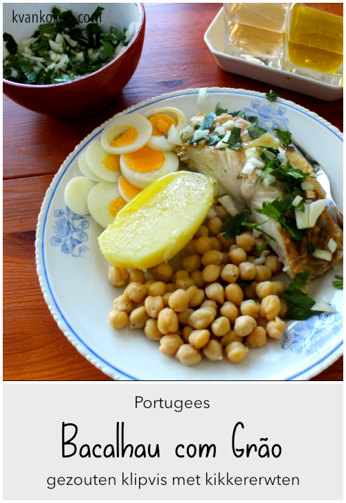 Als we het nu over armeluis voedsel hebben, dan is deze schotel er zeker één van. Gezouten vis met geweekte erwten. Doe even je ogen dicht en je kunt je zo maar voorstellen dat Columbus het op zijn reis over de oneindige oceaan ook moet hebben gegeten. Toch is het daarom niet minder lekker. Ik heb het mezelf weer gemakkelijk gemaakt door diepvries bacalhau te kopen en de erwten uit blik te halen. Je schijnt dit allemaal in een pan te kunnen klaarmaken, maar aangezien ik eieren toch liever apart kook en de kikkererwten niet kapot wil koken heb ik toch maar een paar pannetjes meer op het vuur gezet.
