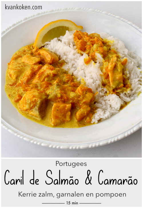 Hoewel er meer en meer zalm gegeten wordt in Portugal, behoort het niet tot de traditionele keuken. In het standaardwerk van Maria de Lourdes Modesto staat niet één recept van dit lekkere gezonde visje. Ik heb op de website van een van de grootste visleveranciers Pescanova wel een recept gevonden van zalm in een milde kerriesaus. Natuurlijk heb ik er mijn eigen draai aan gegeven en ook de kooktijden iets aangepast. De zalm gaart in de hitte van de saus en hoeft niet meer te koken, zo blijft het mals. Het resultaat is een ongelofelijk lekkere maaltijd die in minder dan 20 minuten op tafel staat en waar je van blijft eten. Zonder graatjes natuurlijk en koolhydraatbeperkt!