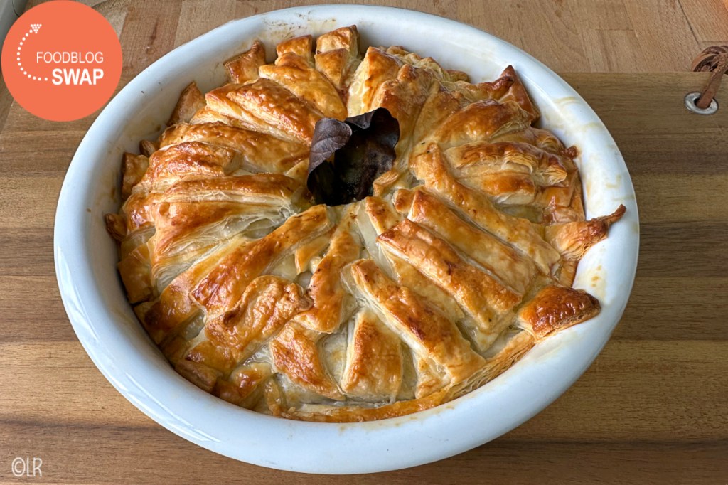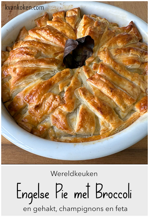 Nu nog mijn eigen draai eraan geven. Ik besloot er een echte fusion dish van te maken. De hartige taart, die wij ook als quiche uit Frankrijk kennen, heeft tamelijk veel ei om de vulling te binden. In plaats van een quiche, maakte ik er een, van oorsprong Engelse, pie van. De vulling zonder ei in een ovenschaal en dan alleen een dakje van bladerdeeg.