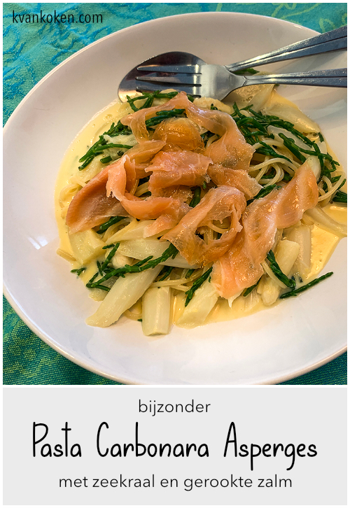 Juist toen het aspergeseizoen was gestopt, begon het seizoen van de zeekraal. Ook iets waar ik gek op ben. Daar had ik nog een half bakje van staan in de koelkast naast een aangebroken pakje gerookte zalm. Vier keer lekker dus, laten we het gewoon eens samen proberen.