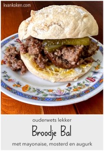 Ooit lang geleden, toen ik nog jong was kon je in een goede kroeg altijd wel iets lekkers te eten krijgen. Op de hoek van de toog stond dan een grote pot met zure bommen (grote bijna ronde augurken) en soms ook ingelegde eieren. In een beetje café kon je ook wel een tosti krijgen of zelfs een uitsmijter al dan niet met kaas eronder op een witte boterham natuurlijk. Had je het echt goed getroffen dan stond er ook een broodje bal op het leitje aan de muur. Een heerlijke gehaktbal met een beetje jus. Op een broodje, nou eigenlijk gewoon een boterham, maar de uitdrukking broodje bal is gebleven.