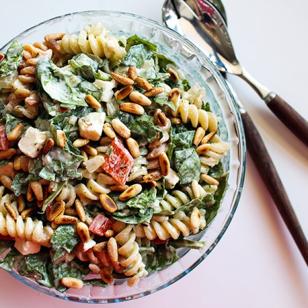 Lauwwarme pastasalade met spinazie en feta