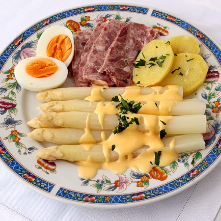 Blanke asperges met ham, ei en hollandaisesaus